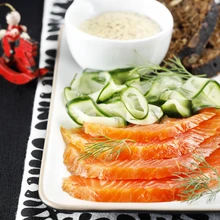 Kõrvale tõsta nõrutatud kurgiviilud, viilutatud rukkileib ning väikeses kausis tilli-sinepikaste.