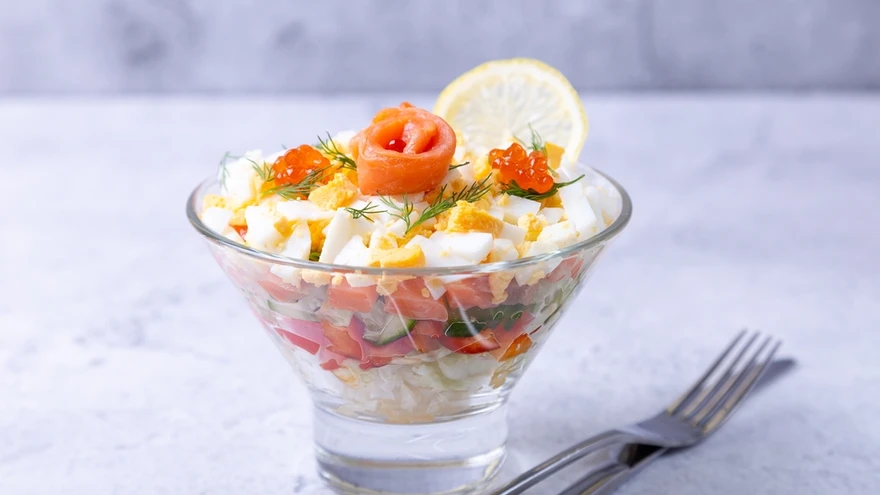 Lao klaasi kihiti hakitud muna, lõhe, kurgi ja avokaadotükke. Tõsta lusikaga kastet peale. Kõige peale pane hakitud muna ja hakitud till. Kaunista lõhelõikude ja kalamarjaga.