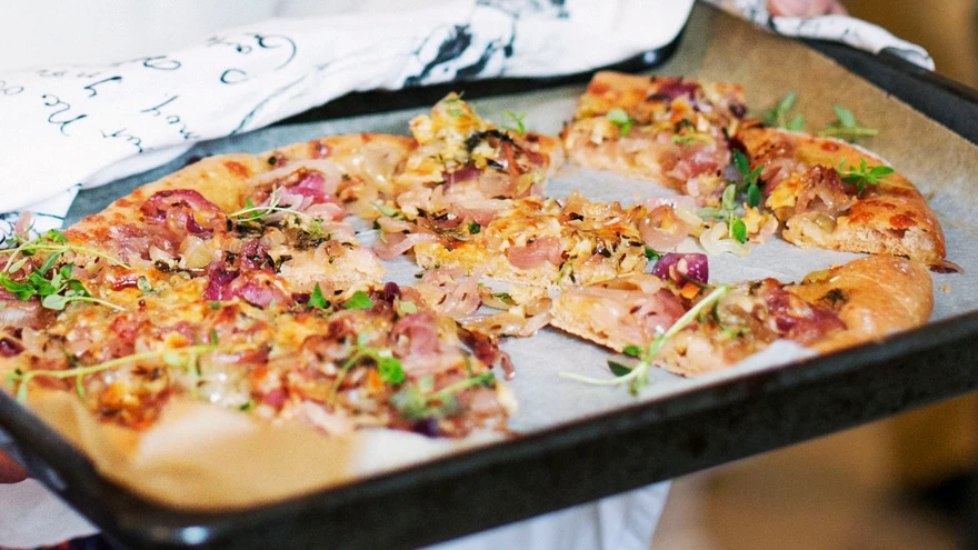 * Valmista põhi. Lahusta murendatud pärm jahedas vees. Lisa sool, suhkur ja õli. Lisa kogu aeg segades vähehaaval juurde jahu. Sõtku tainast kuni see on sitke ja tuleb kausi servast lahti.. Lase kerkida umbes tund. Valmista sel ajal täidis.